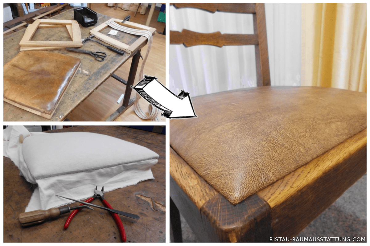 Diese alten Esszimmerstühle haben wir aufgepolstert und mit Kunstleder bezogen. Wir können Ihnen eine breite Palette an Leder, Lederimitaten und anderen Bezügen anbieten. Lassen Sie sich dazu gern bei uns beraten.